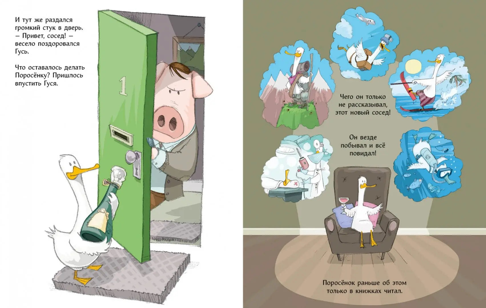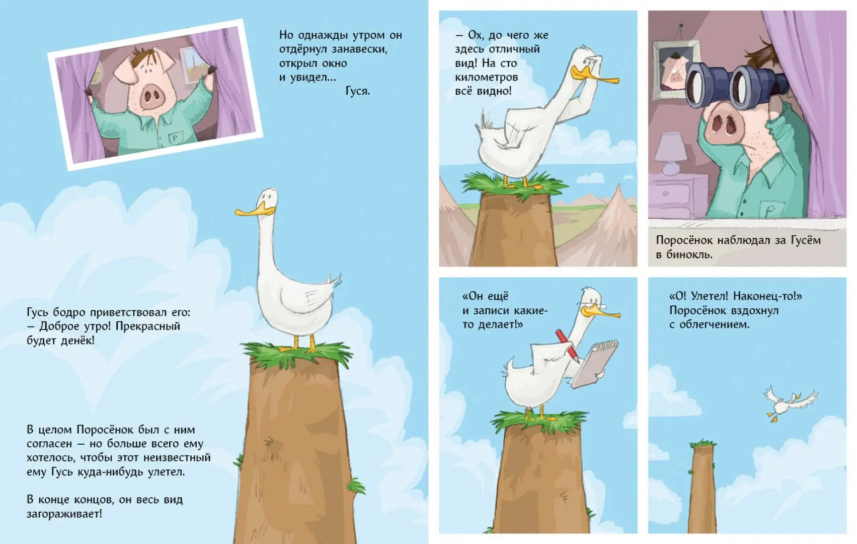 Шумный и поначалу весьма навязчивый, Гусь оглушил Поросёнка рассказами о дальних странах и экстремальных развлечениях. Он перепробовал всё на свете - от катания на лыжах и альпинизма до парашютного спорта и подводного плавания. Поросёнок же просто хотел, чтобы его оставили в покое.
