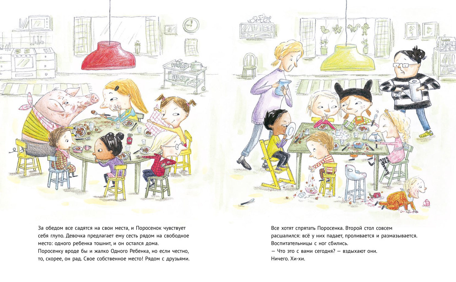 Поросенок живет в загончике напротив детского сада. Там дети съезжают с горки, пахнет свежеиспеченными булочками. Детям весело, а поросенку одиноко. Однажды он решил, что пора действовать, и отправился в детский сад, хотя посторонним туда нельзя. Дети очень обрадовались и придумали замаскировать поросенка под отсутствующего ребенка, чтобы воспитательница Длинная Лена ничего не заподозрила. Но Длинную Лену не проведешь… Правда, если поросенку нельзя в детский сад, кто сказал, что дети не могу прийти в гости к поросенку!