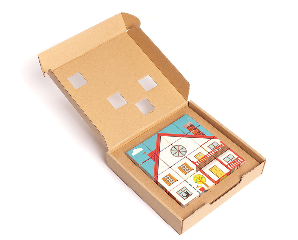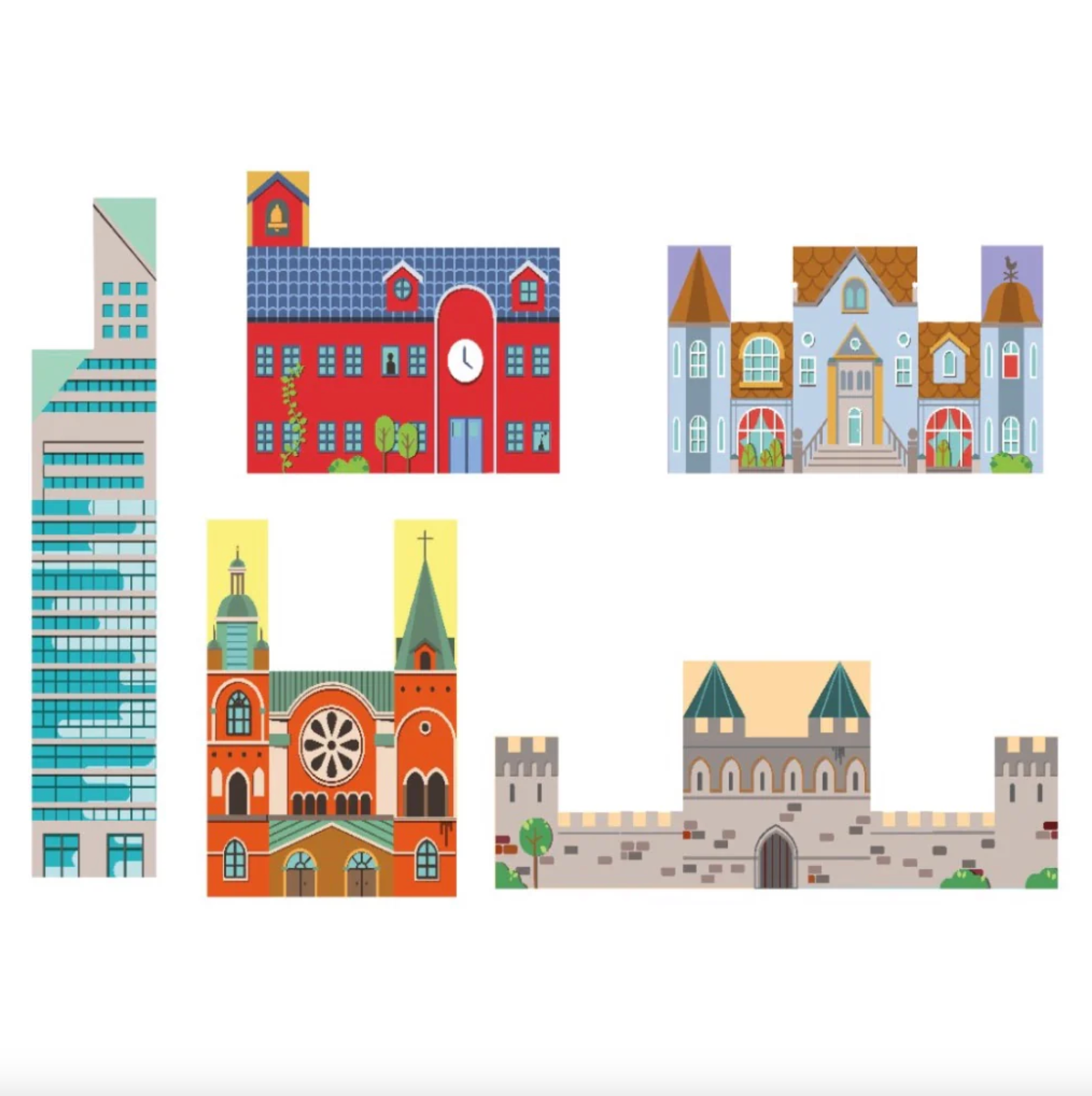 A set of 16 wooden cubes that can be used to build 6 different architectural structures, such as a skyscraper, cathedral, castle, house, palace, and tenement building. Each structure has its own characteristic style and details, allowing children to learn how to recognize different types of architecture and their key features.