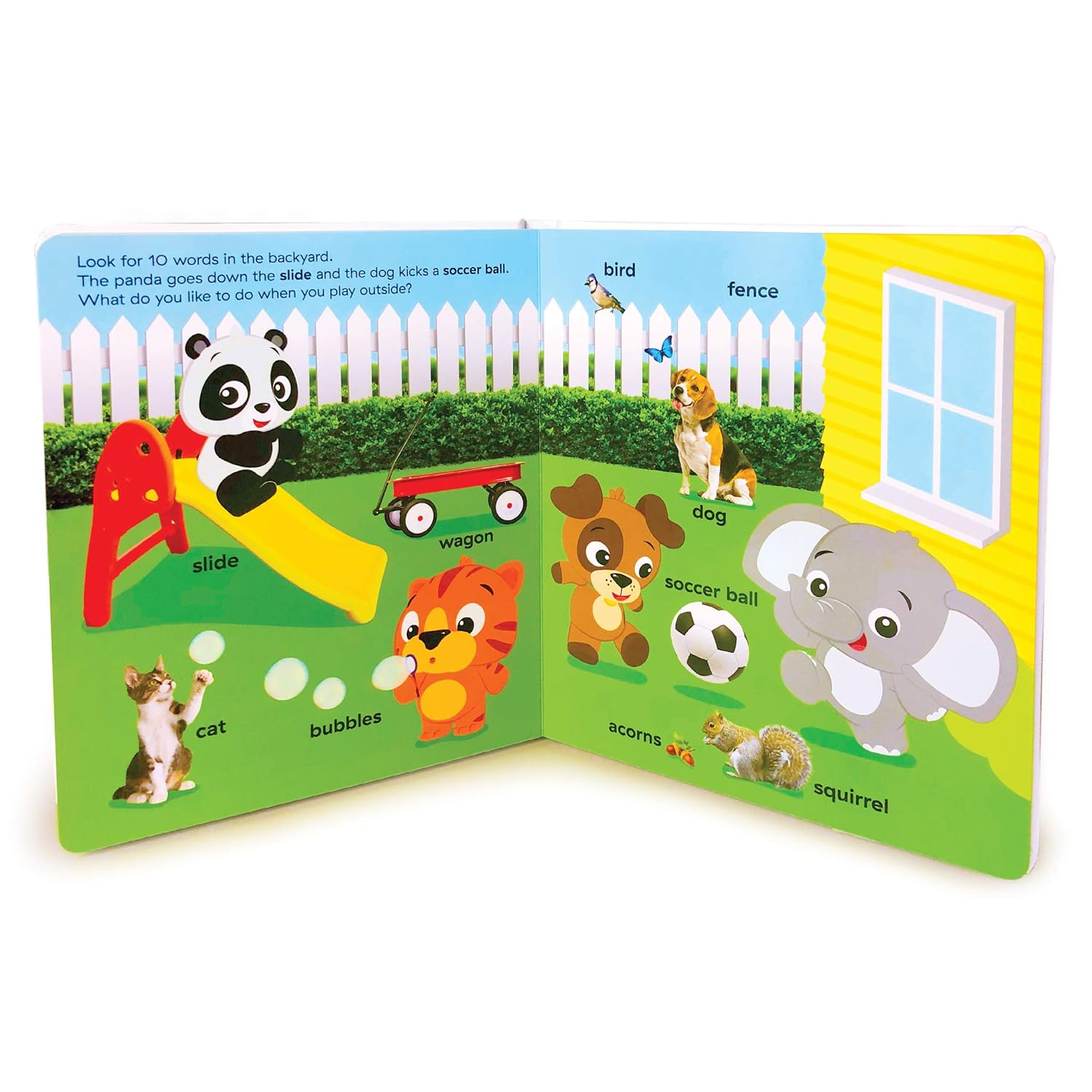 The world is full of wonderful words to learn so let's get started! Discover 100 new words with Baby Einstein. Let's go to the beach, garden, school, farm, and other great places to see what words we can find! Your Baby Einstein friends are curious, just like you! Watch the panda build a sandcastle while the giraffe draws with crayons and the tiger blows bubbles. Bright, bold illustrations are combined with real-life photographs to teach and discover these first words. Includes a fun activity page ad the end of the book to go back to each scene for extra learning and fun!