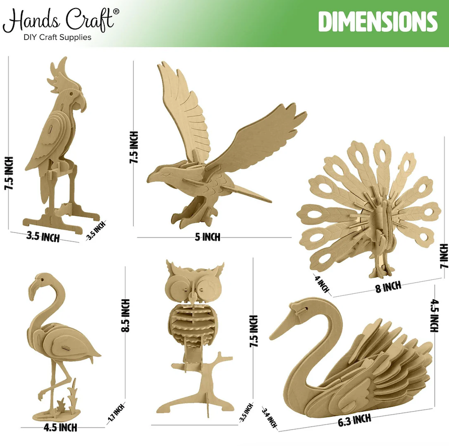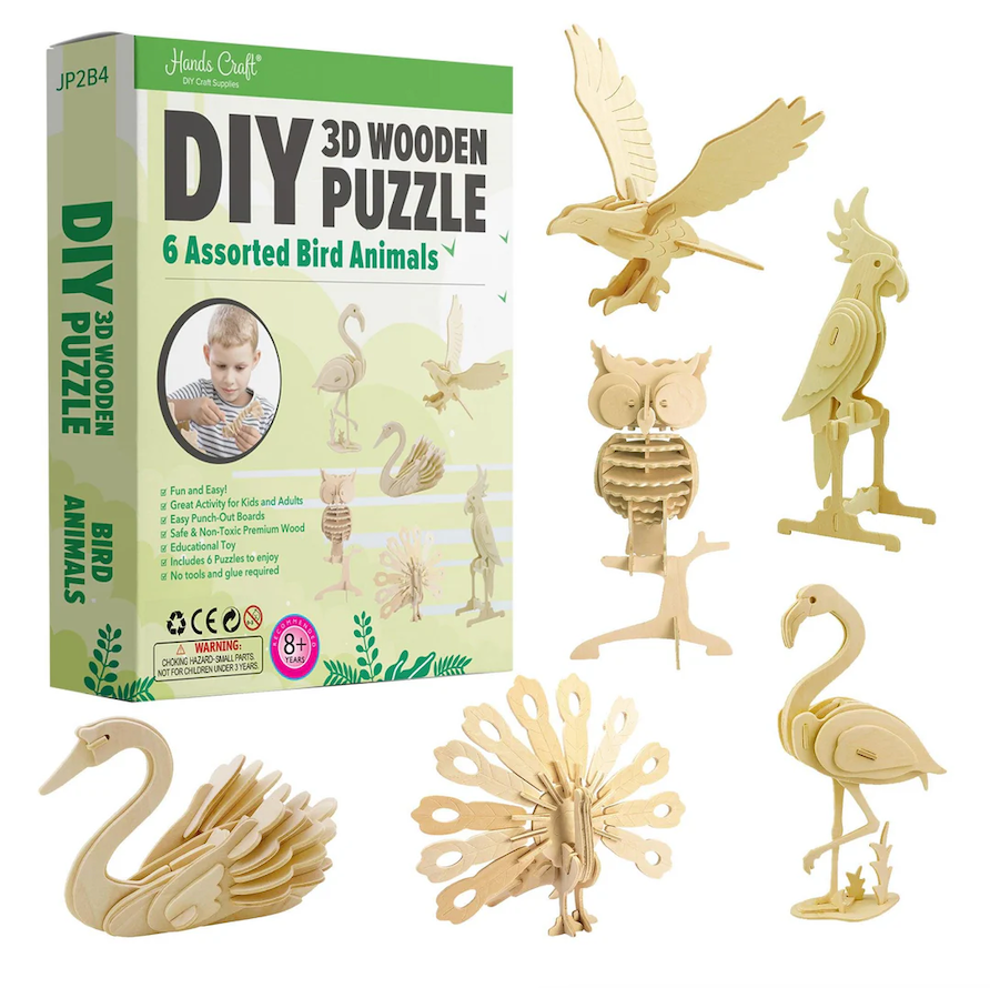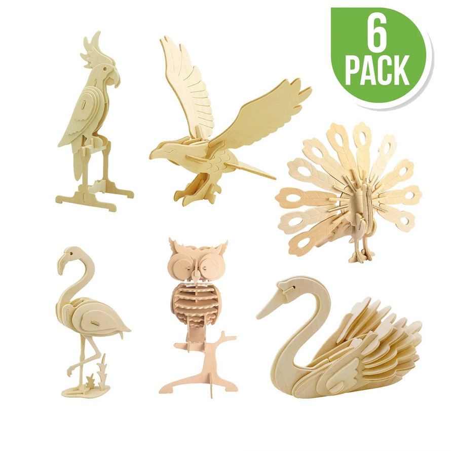 Assortment of 6 DIY 3D wooden bird puzzles. Bundle pack includes an eagle, swan, peacock, parrot, flamingo, and owl.