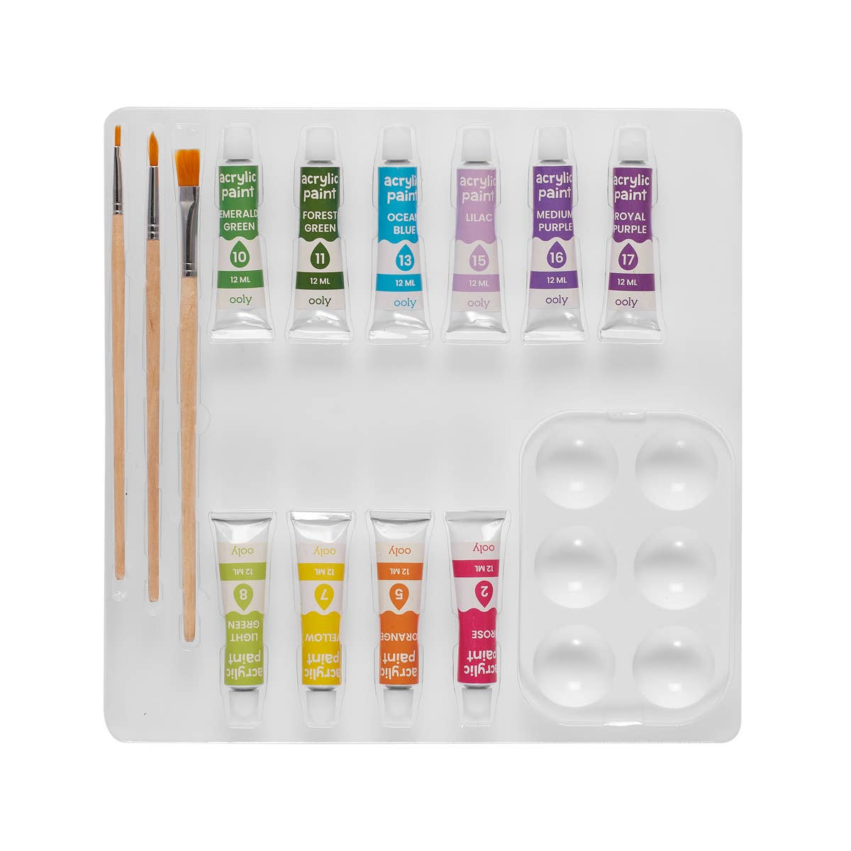 Includes a 11.8” x 11.8” outlined canvas, 10 paint tubes, 1 palette and 3 paint brushes See how it works: blog.ooly.com/product-how-to Suitable for ages 8 and up
