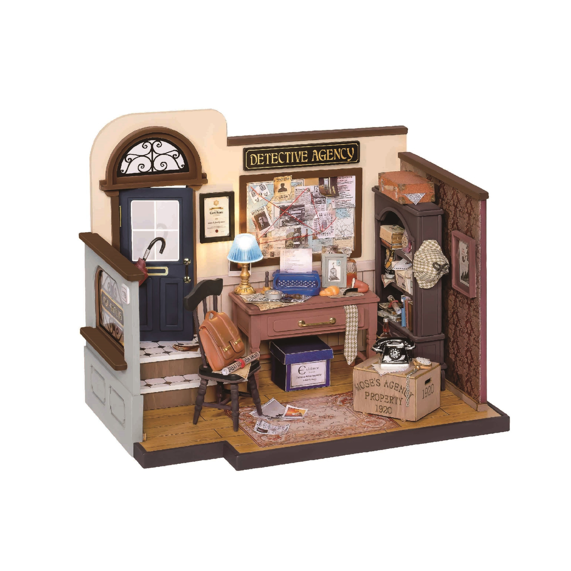 DIY Miniature House Kit: Mose's Detective Agency with LED Lights by Hands Craft. Perfect for birthdays, a crafting hobby project, or home or office decor.