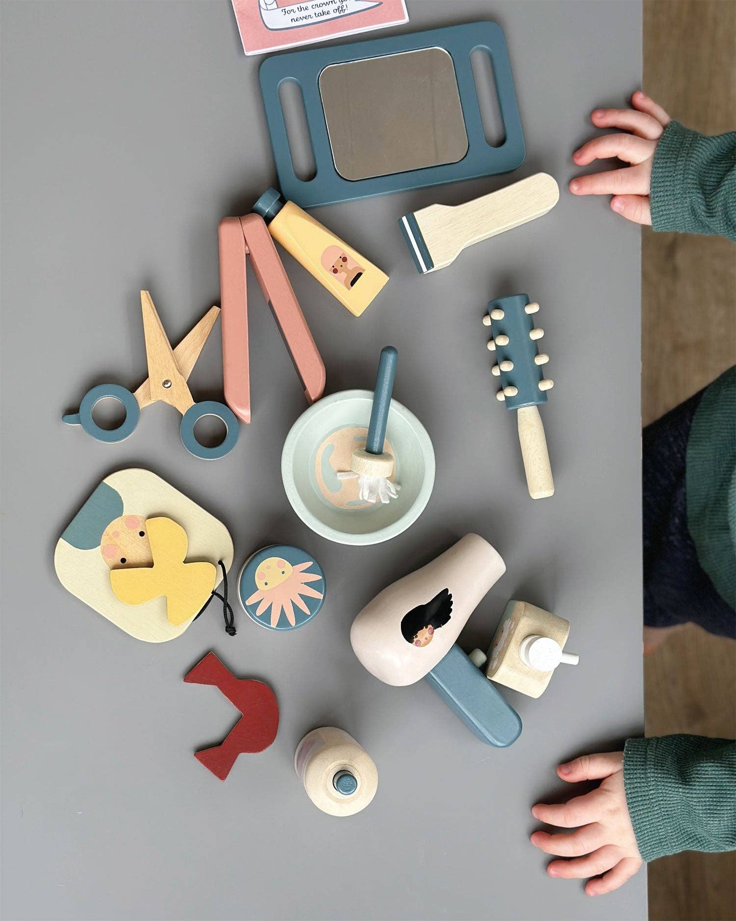 Set accessories include: a round brush, a hairdryer, straighteners and scissors, clippers, hairspray, pomade & shampoo, mixing bowl and brush with tube of hair color, double-sided magnetic face board with 6 magnetic hairstyles, fold out hair-dressing magazine, hand-held hairdressing mirror.