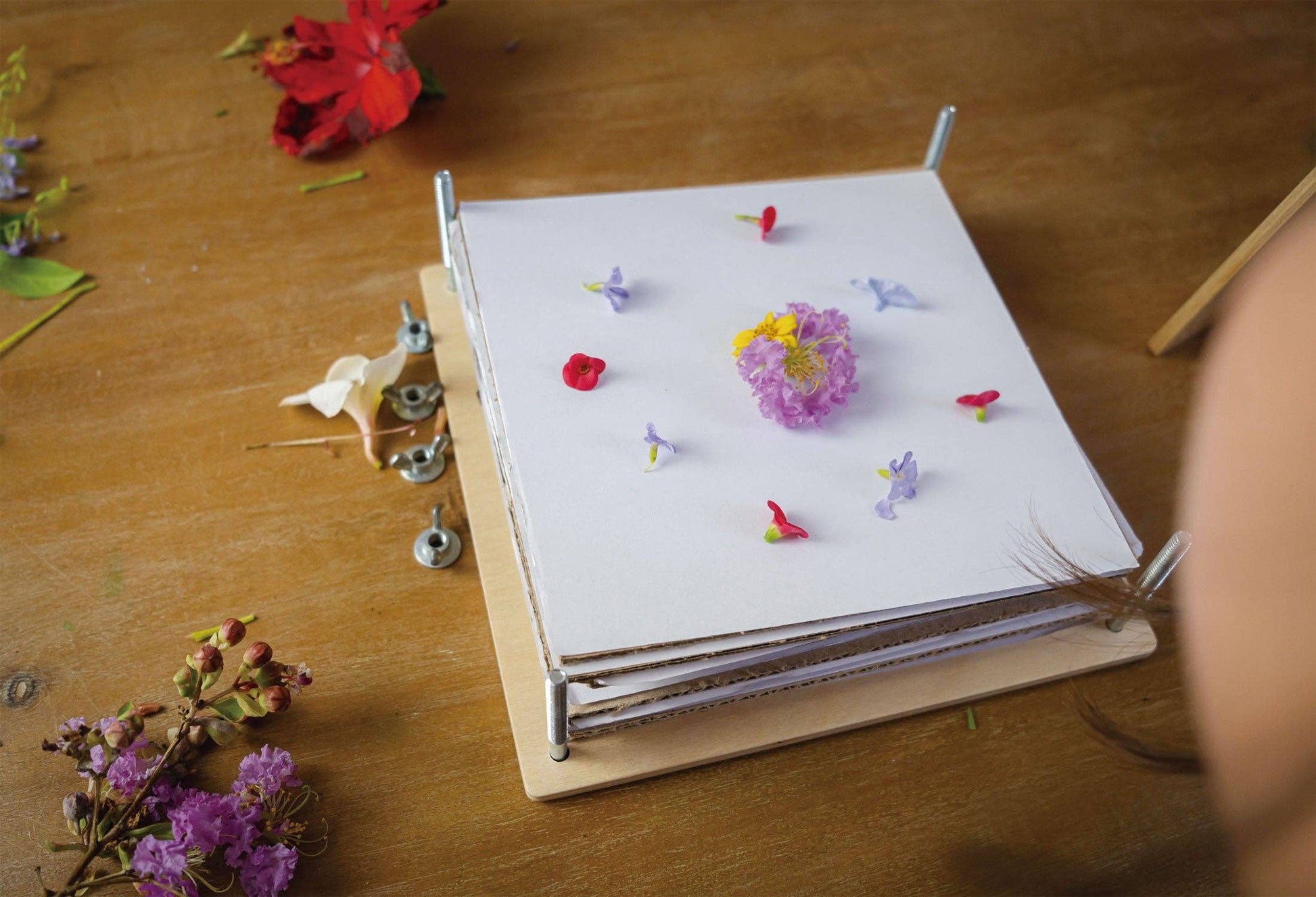 A wooden flower press with paper sheets and metal screws at each corner to tightly press the pages together. Fill your paper pages with flowers and leaves and press them to create delicate flat dried and preserved flowers, ready to use in any art and craft activity.