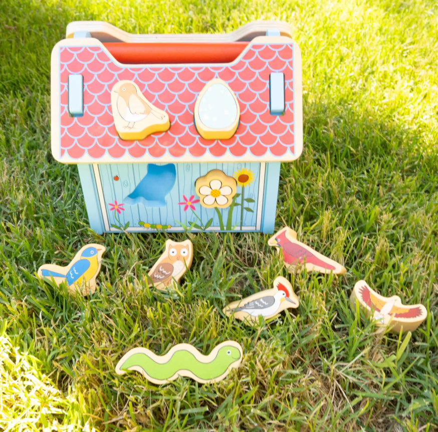 Sorter boxes are a classic toy for early childhood development. Motor skills and matching are engaged as little ones sort the chunky play shapes into the adorable bird house. Birdhouse roof removes for easy storage of the play pieces, and a sturdy wooden handle lets your toddler grab up their favorite toy and take it on an adventure. FSC-certified woods and all non-toxic paints.