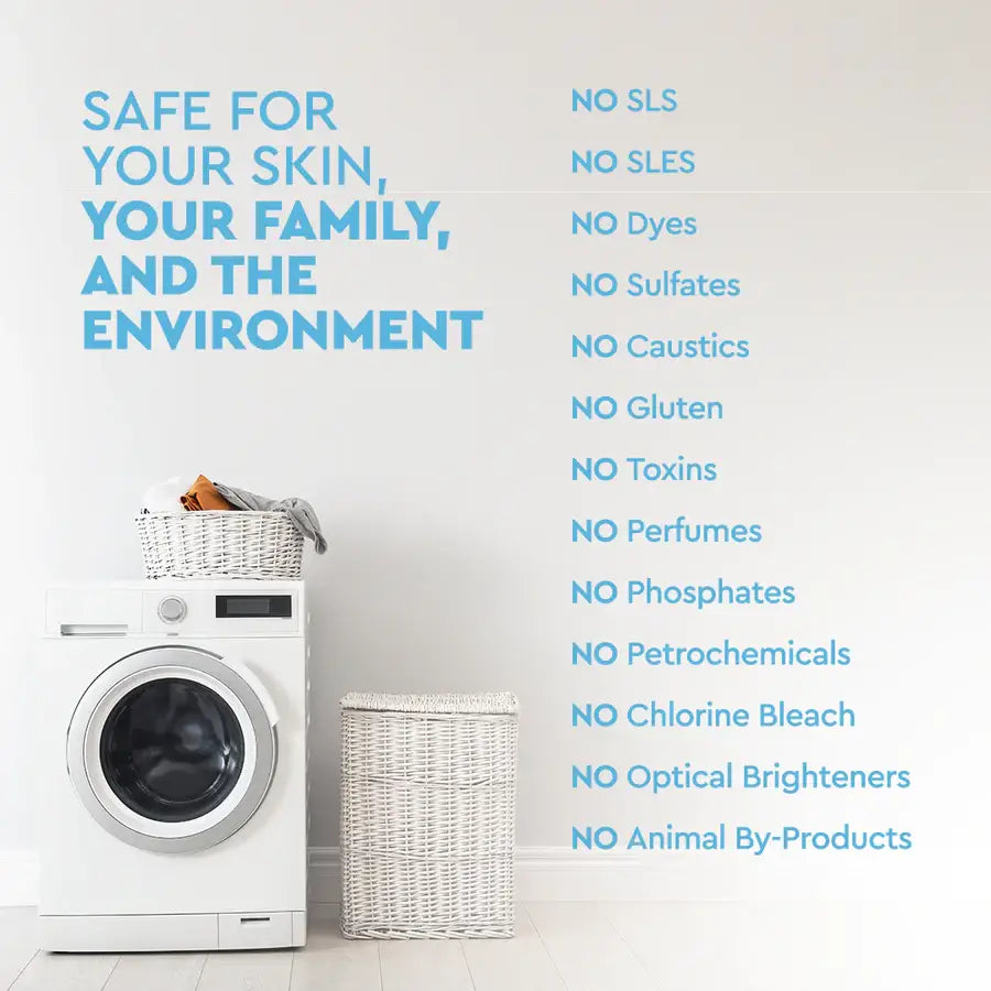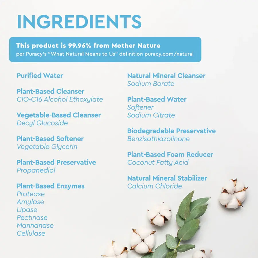 Purified water (Aqua, eau), C10-C16 Alcohol ethoxylate (Plant-based cleanser), Decyl glucoside (Vegetable-based cleanser), Vegetable glycerin (Plant-based skin softener), Propanediol (Plant-based preservative), Protease (Plant-based enzyme), Sodium borate (Mineral cleanser), Amylase (Plant-based enzyme), Sodium citrate (Plant-based water softener), Lipase (Plant-based enzyme), Pectinase (Plant-based enzyme), Mannanase (Plant-based enzyme), Cellulase (Plant-based enzyme), Benzisothiazolinone (Biodegradable preservative), Coconut fatty acid (Plant-based foam reducer), Calcium chloride (Mineral stabilizer)