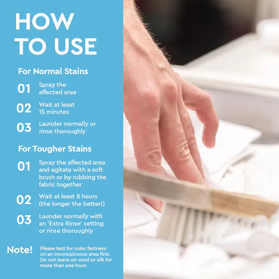 - Spray the stain and let it sit for 15 minutes before washing.