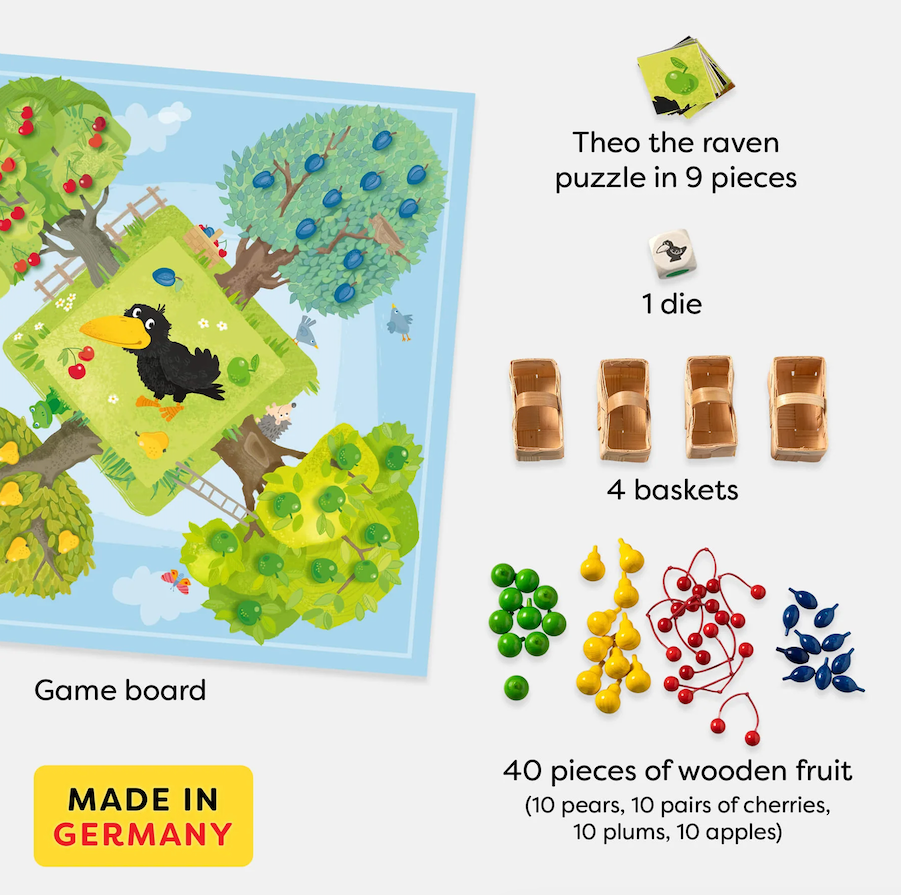 - High-Quality Components: Includes a sturdy game board, color die, 40 fruit pieces, baskets, and a raven puzzle.