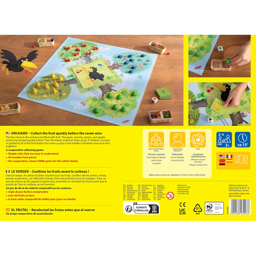 Race to harvest with Orchard – A Classic Cooperative Game! Gather your team and pick the ripe fruit from the orchard before the crafty raven swoops in! This beloved game, celebrating over 30 years and more than 2.5 million copies sold, invites players to work together to collect apples, pears, cherries, and plums. A perfect blend of teamwork and fun!