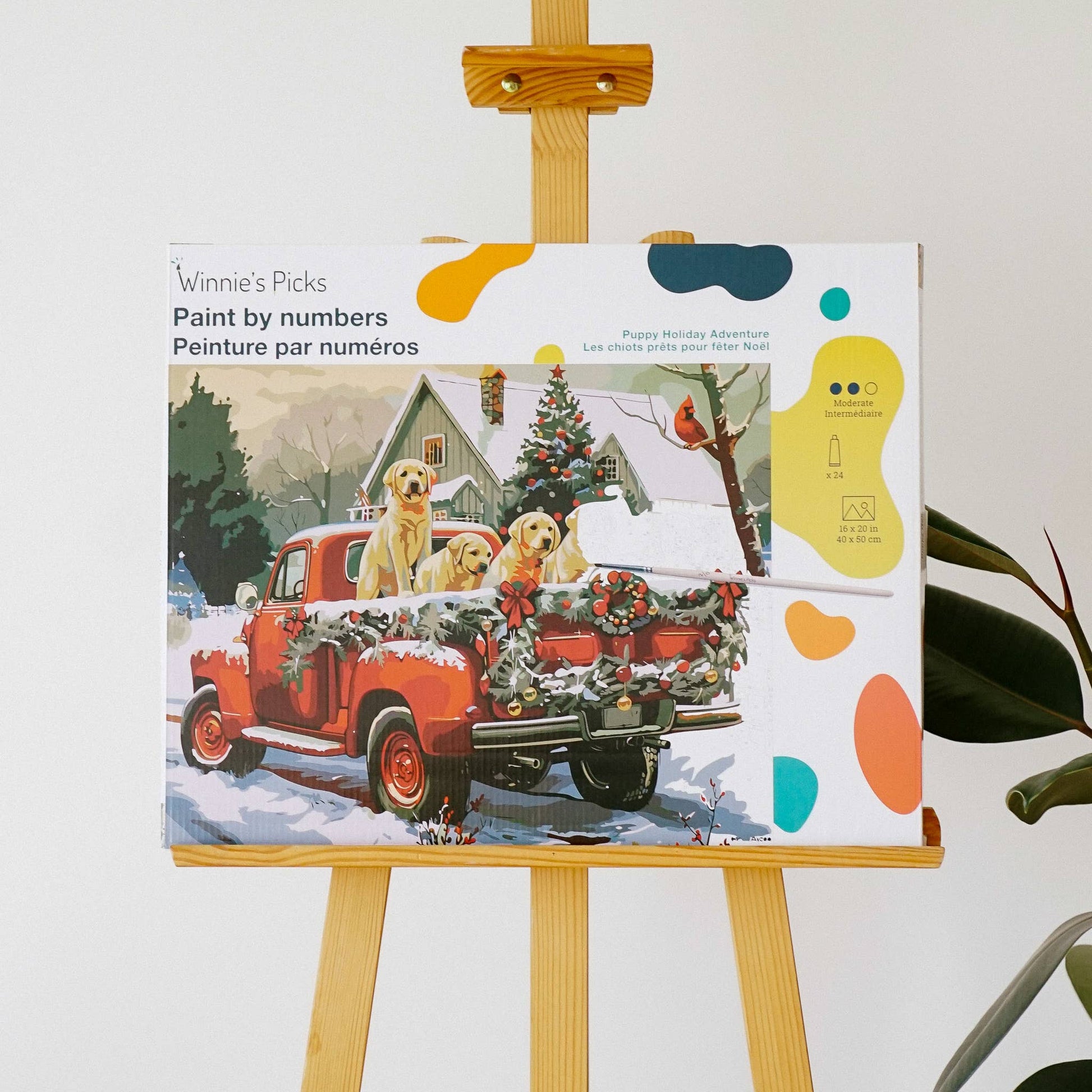 Ready for some holiday fun with a side of puppy love? This Puppy Holiday Adventure paint by numbers kit will bring out the holiday cheer in you! Picture this: adorable puppies riding in a festive red truck, surrounded by snowy fields, sparkling wreaths, and twinkling garlands. It’s the perfect way to celebrate the season—and trust us, you’ll be smiling with every brushstroke!