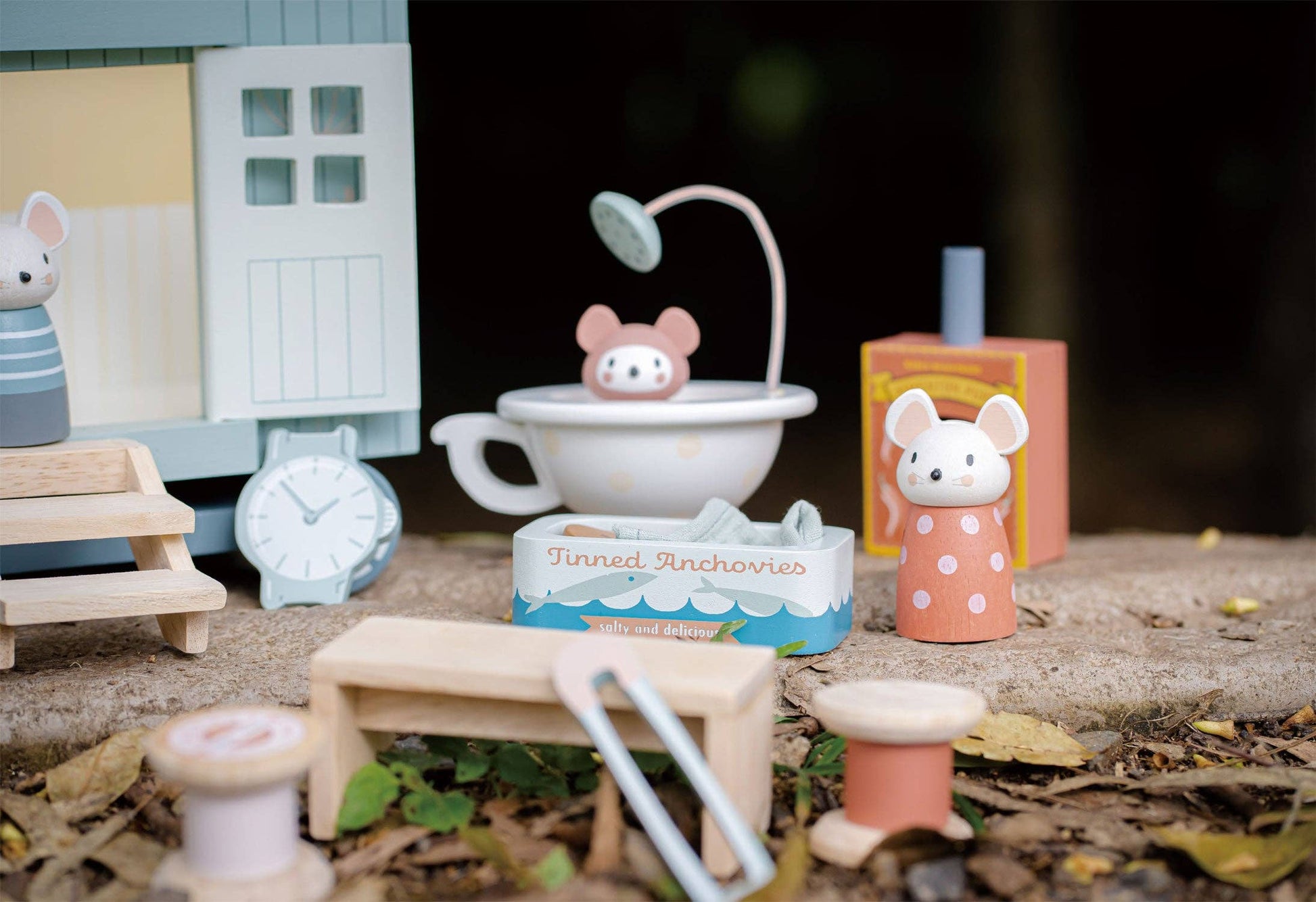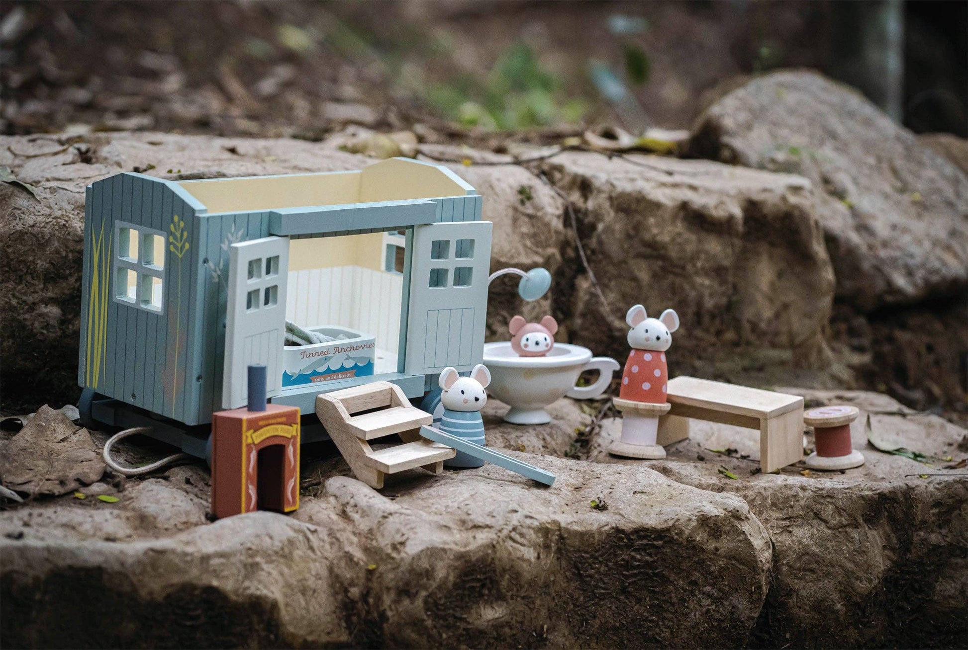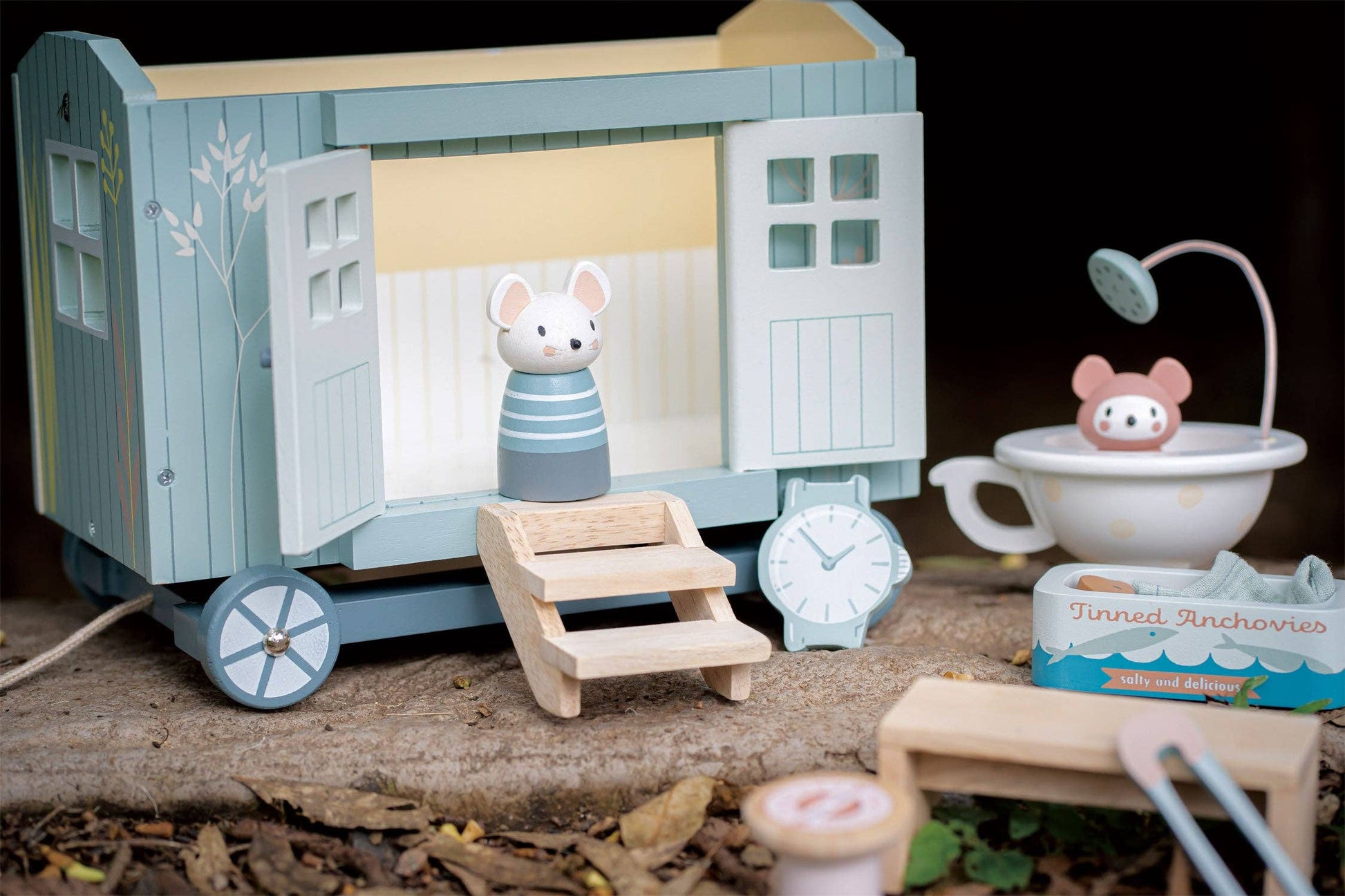 A wonderful addition to our Merrywood Tales collection. This shepherd’s hut is the perfect glamping staycation for our new family of mice. They have borrowed some human-sized trinkets to use as essential furniture in their hut. A teacup makes a perfect shower for a little mouse. Spools of old thread make for chairs to sit on, a tin of sardines creates the comfort of a baby cot and tucks neatly underneath a simple bed inside. A pimento tin doubles up as a small wood-burning stove. A safety pin becomes a towel rack and an old watch provides the time of day. Little stairs can be clipped to the front door to help them with the step-down. All can be accessed by removing the roof, or through the little doors at the front.