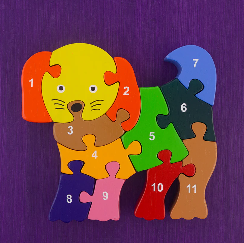 This puppy dog puzzle was handcrafted from sustainable Sri Lankan plantation rubber wood and was painted with non-toxic coatings compliant with US toy safety standards.